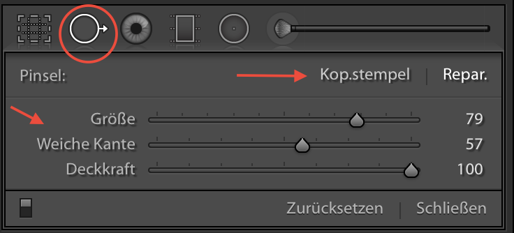 14 KorrekturpinselNoch einmal dasselbe in Grün, der „Korrekturpinsel“. Gleicher Leistungsumfang wie die beiden vorigen Instrumente, jedoch (wie der Name schon sagt) als Pinsel, mit dem man freihändig arbeiten kann um z. B. Kantenlinien gezielt nachzuschärfen, unregelmäßig geformte Bildteile aufzuhellen oder abzudunkeln oder Bildteile in der Farbe zu bearbeiten.