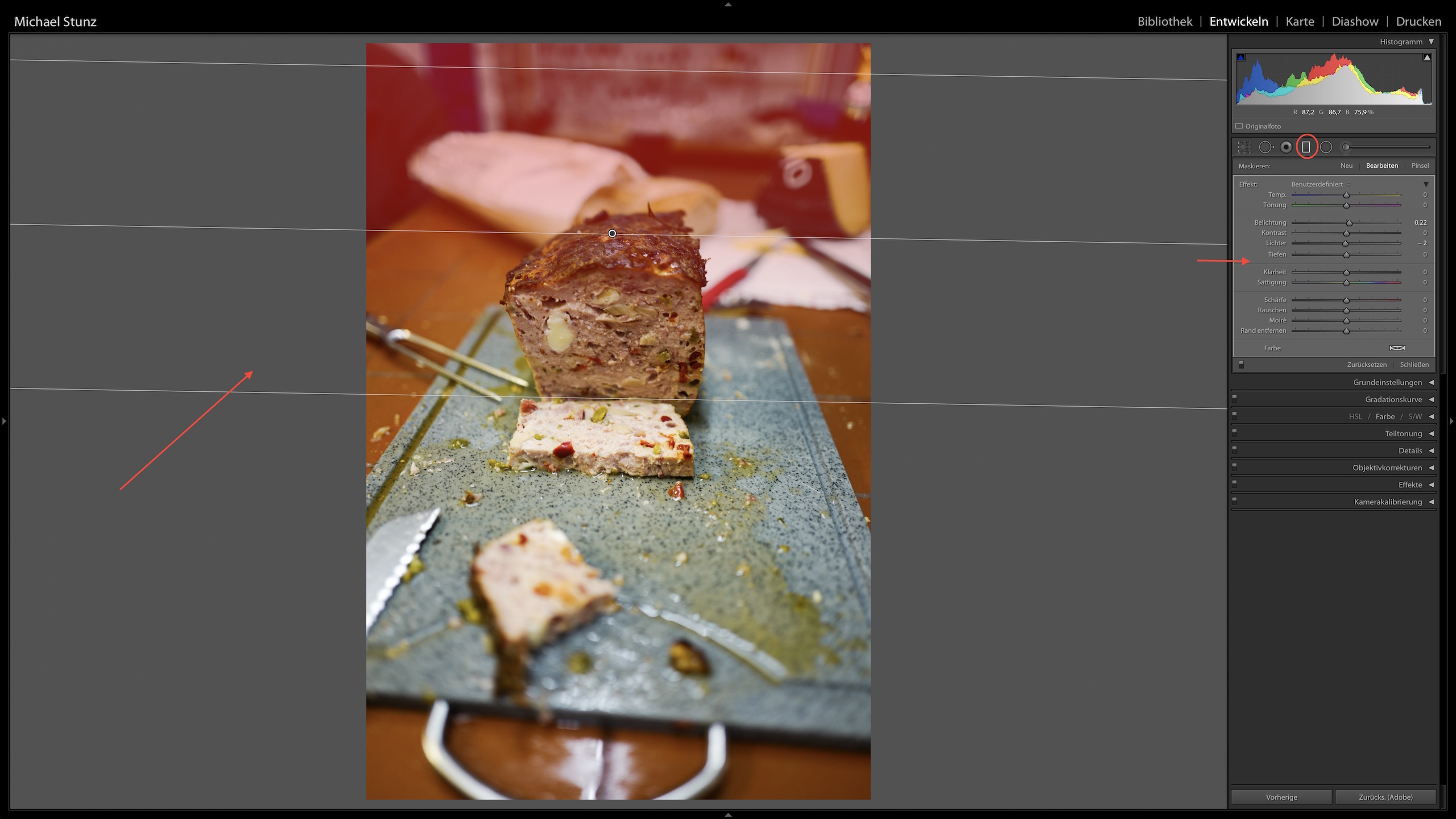 Mit dem „Verlaufsfiter“ könnt Ihr (fast) alle Bildbearbeitungsmöglichkeiten innerhalb eines ausgewählten, verlaufenden Bereichs vornehmen. Ein Beispiel, das bei mir hin und wieder vorkommt, ist die Verdunkelung eines viel zu hellen blauen Himmels. Durch Drücken dar Taste O könnt Ihr euch übrigens sehr schön rot anzeigen lassen, wo und wie stark der Filter wirkt.