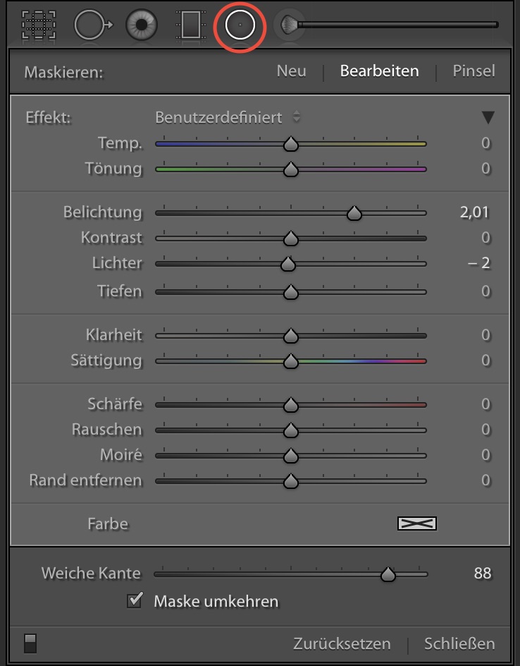 12 RadialfilterDer „Radialfilter“ bietet die gleichen Bearbeitungsmöglichkeiten in anderer Verpackung. Hier könnt Ihr mit der maus ein Oval aufziehen und dann innerhalb dieses Ovals die Bearbeitungsschritte vornehmen. Dieser Filter ist z. B. sehr gut zum Aufhellen von im Schatten liegenden Augenpartien zu gebrauchen. Nehmt Ihr das Häckchen bei „Maske umkehren“ heraus, wird der Bearbeitungsbereich umgedreht. Alles innerhalb des Ovals bleibt und alles außerhalb wird beeinflusst. Auch hier hilft die Taste O mit einem roten Bereich.