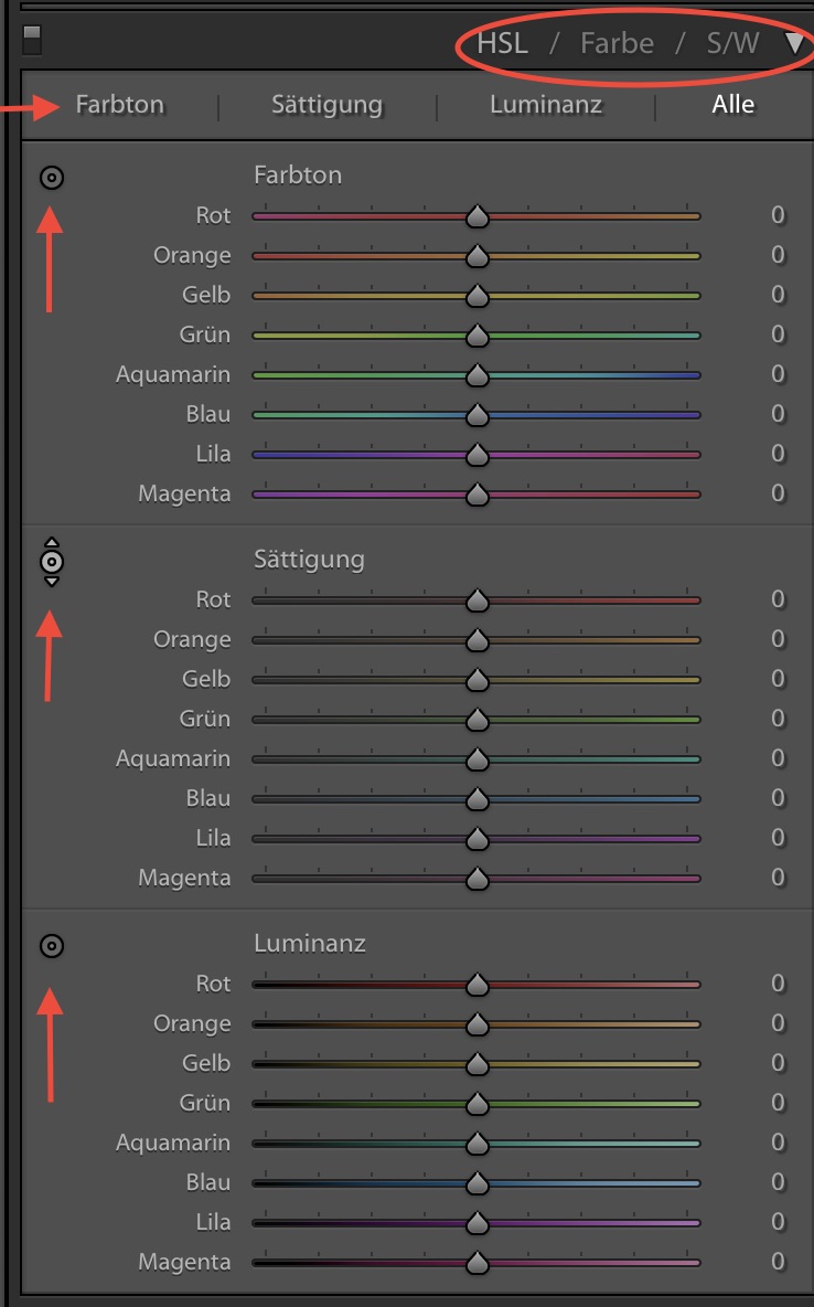 Ihr habt es fast geschafft. Nur noch zwei Dinge folgen, die ich zwar nur sehr selten benutze aber dennoch erwähnen möchte. Nummer Eins nennt sich „HSL / Farbe / S/W“. Hier gibt es eine Unmenge von Reglern in den verschiedenen Optionen (Bild zeigt die Gesamtübersicht) um einzelne Farbtöne gezielt zu bearbeiten. Übrigens auch bei Schwarz/Weiß-Bildern! Sollte Euch also z. B. mal ein Gesicht zu rot strahlen und „Sättigung“ bzw. „Dynamik“ (siehe Teil 4) nicht helfen, versucht es hiermit. Sehr hilfreich finde ich die kleinen Böbbel links von den Reglern. Auf so einen draufgeklickt, dann ins Bild und das Mausrad rauf- oder runterradeln – es werden genau die Farbtöne verändert auf denen der Cursor steht.