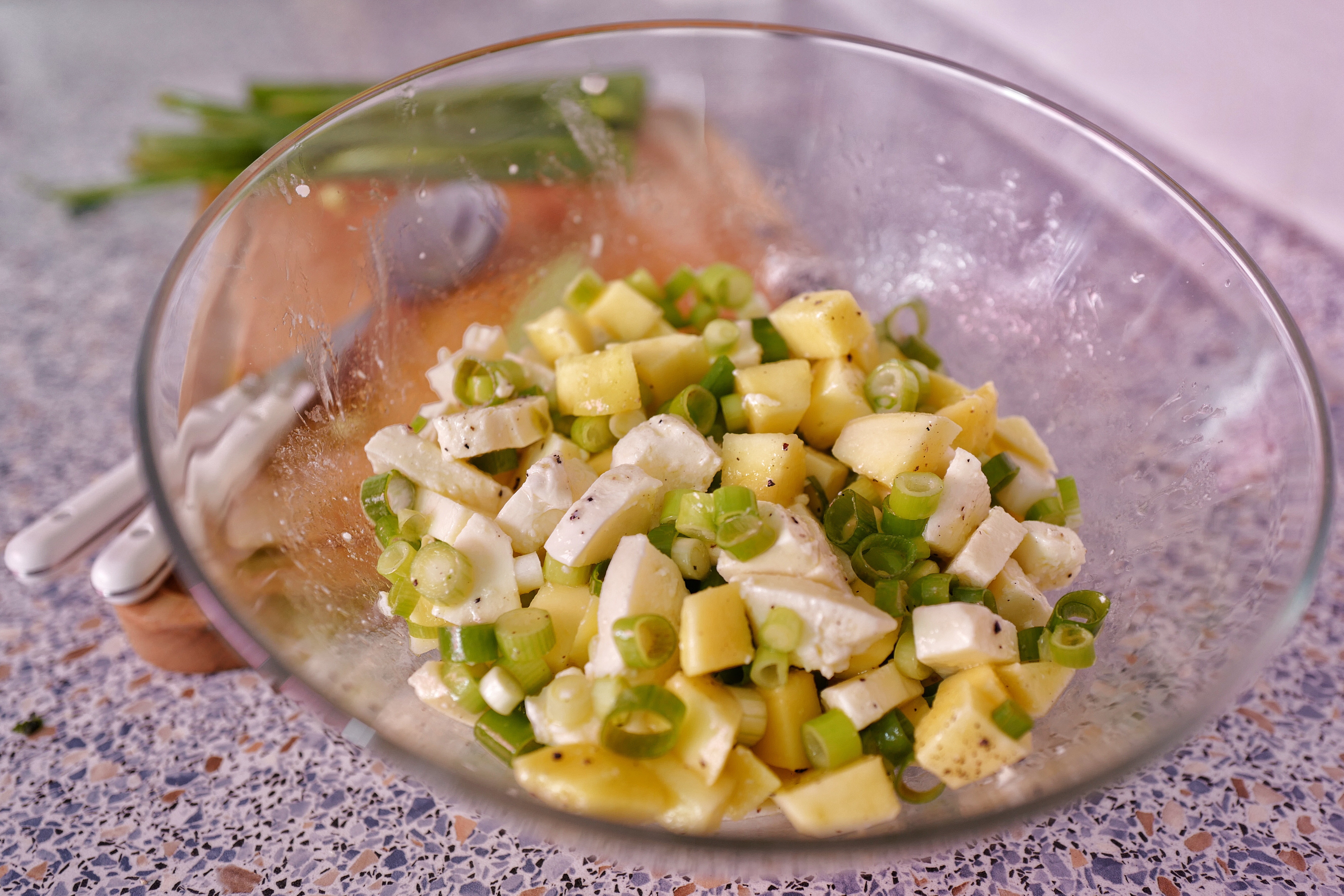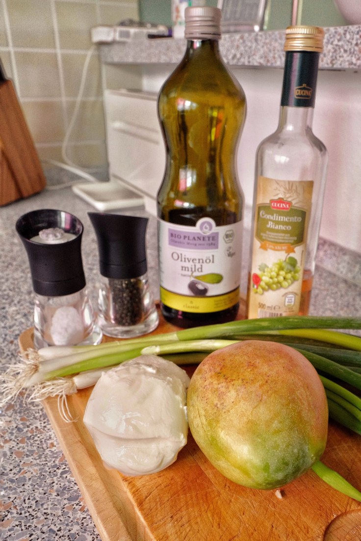 Es ist ein Salat aus Mozzarella, Lauchzwiebeln und Mango (Ja genau, keine Tomaten). Ihr benötigt also: