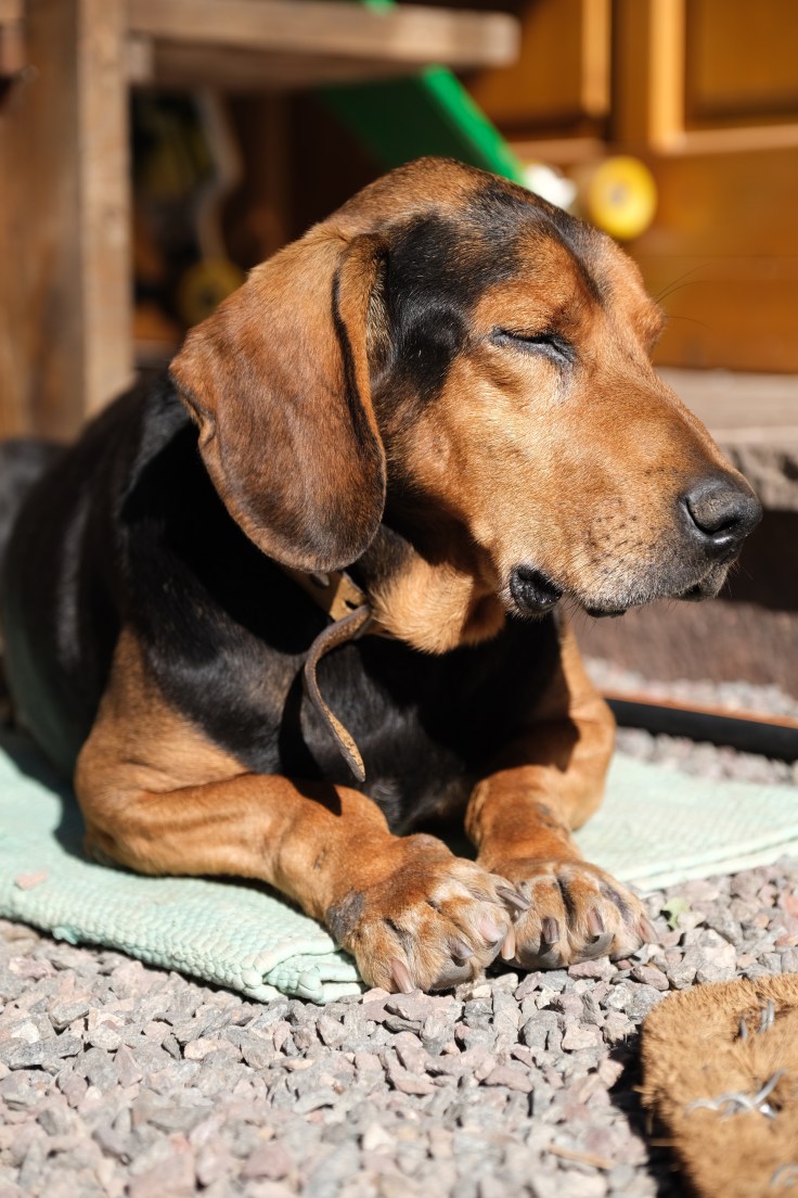 Leider gab es bei unserer Rückkehr zum Haghof auch eine traurige Nachricht, denn Moritz, der Senior-Hofhund, hatte sich am Vorabend schlafen gelegt und wachte heute morgen nicht mehr auf. Ja, er war „nur“ ein Hund, aber in den vielen Jahren, in denen wir ihn vom Welpen zum Hundeopa haben reifen sehen, war er auch irgendwie zu einem guten Kumpel geworden, den wir vermissen werden. Hier noch ein Foto, geschossen an seinem letzten Lebenstag.