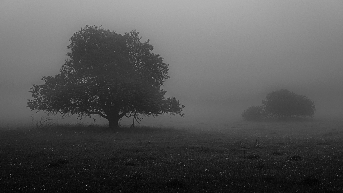 Der dritte – und damit letzte volle Aufenthaltstag – begann da, wir wir am Vortag schon waren: am Schwarzen Moor. Diesmal allerdings mit dem Auto, denn wir wollten nur noch eine Location besuchen, die wir beim ersten Mal ausgelassen haben. Ganz in der Nähe des Schwarzen Moors verlief nämlich früher die innerdeutsche Grenze und nur wenige hundert Meter vom Parkplatz entfernt sind einige Relikte davon erhalten geblieben, denen wir noch einen fotografischen Besuch abstatten wollten. Das Wetter hatte auch wieder etwas ganz besonders zu bieten, denn wir bewegten uns in der Moorlandschaft durch eine Nebelsuppe, die jedem altmodischen Gruselfilm gut zu Gesicht gestanden hätte. So wären wir auch beinahe an unserem Ziel vorbei gelaufen, wären nicht auf dem Boden irgendwann merkwürdige Raster-Betonplatten aufgetaucht, denen wir dann gefolgt sind, bis sich die Ruinen aus dem Nebel schälten.