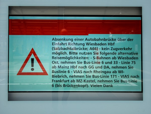 Für alle Nicht-Ortskundigen eine kurze Erklärung: Seit kurzem herrscht hier in und um Wiesbaden ein gewisses Verkehrschaos, verursacht durch eine marode Autobahnbrücke, die sowohl über eine der Haupteinfallstraßen als auch über die zum Hauptbahnhof führenden Gleise führt. Die Brücke ist einsturzgefährdet und darf daher weder befahren noch unterfahren werden. Die Sprengung wird gerade vorbereitet, bis... Continue Reading →
